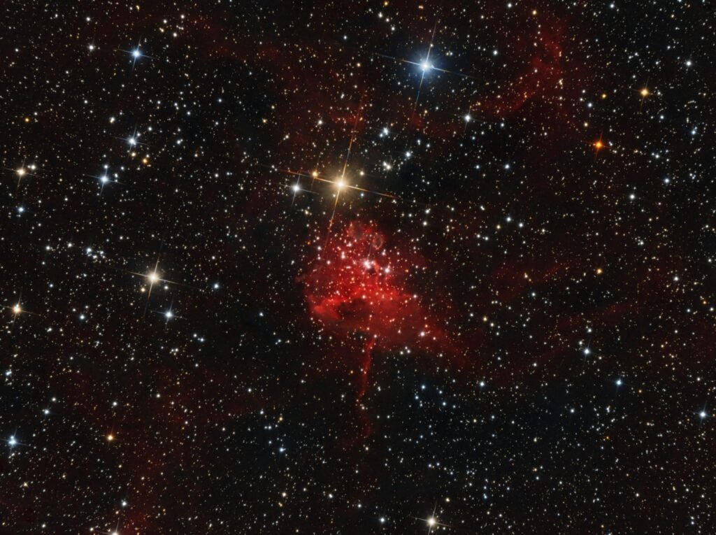 Die Art, wie der offene Sternhaufen in den Emissionsnebel eingebettet ist, hat Ähnlichkeit zum Rosetten- und Kokon-Nebel.