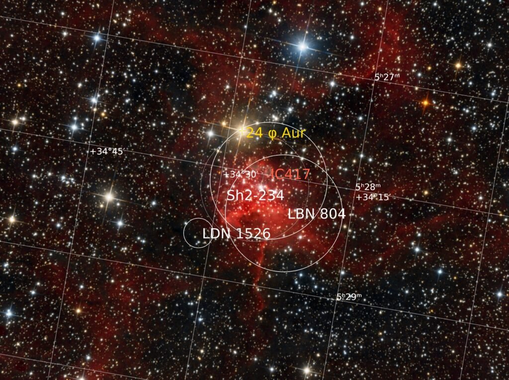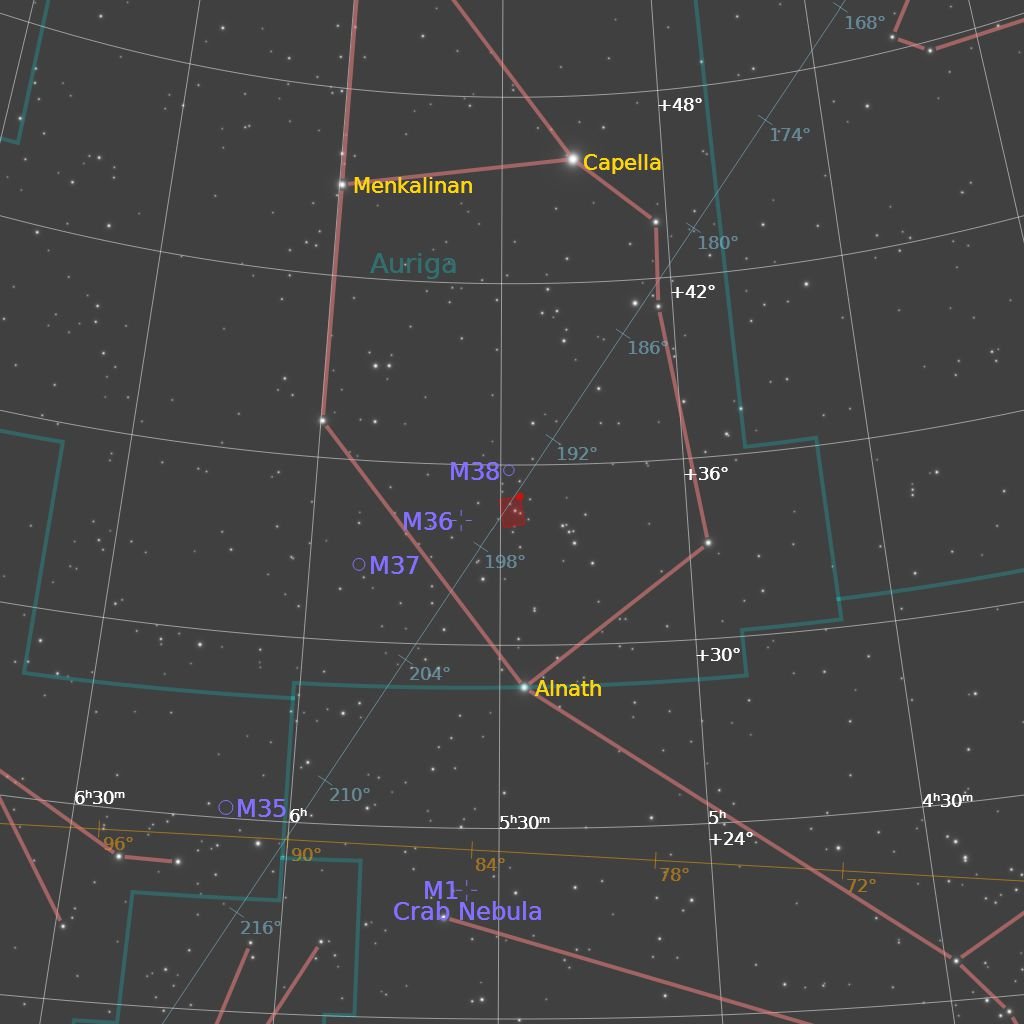 In unmittelbarer Umgebung befinden sich der Nebel NGC 1931, der Flammensternnebel IC 405 und die offenen Sternhaufen Messier 36, Messier 37 und Messier 38.