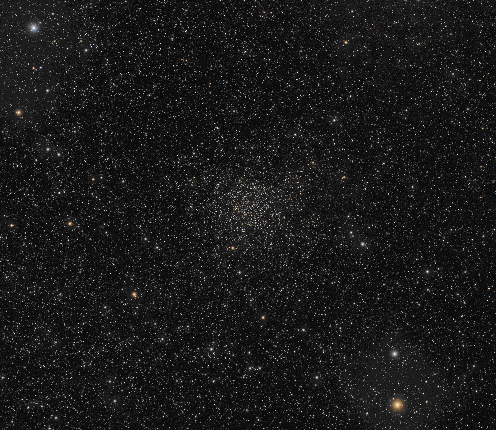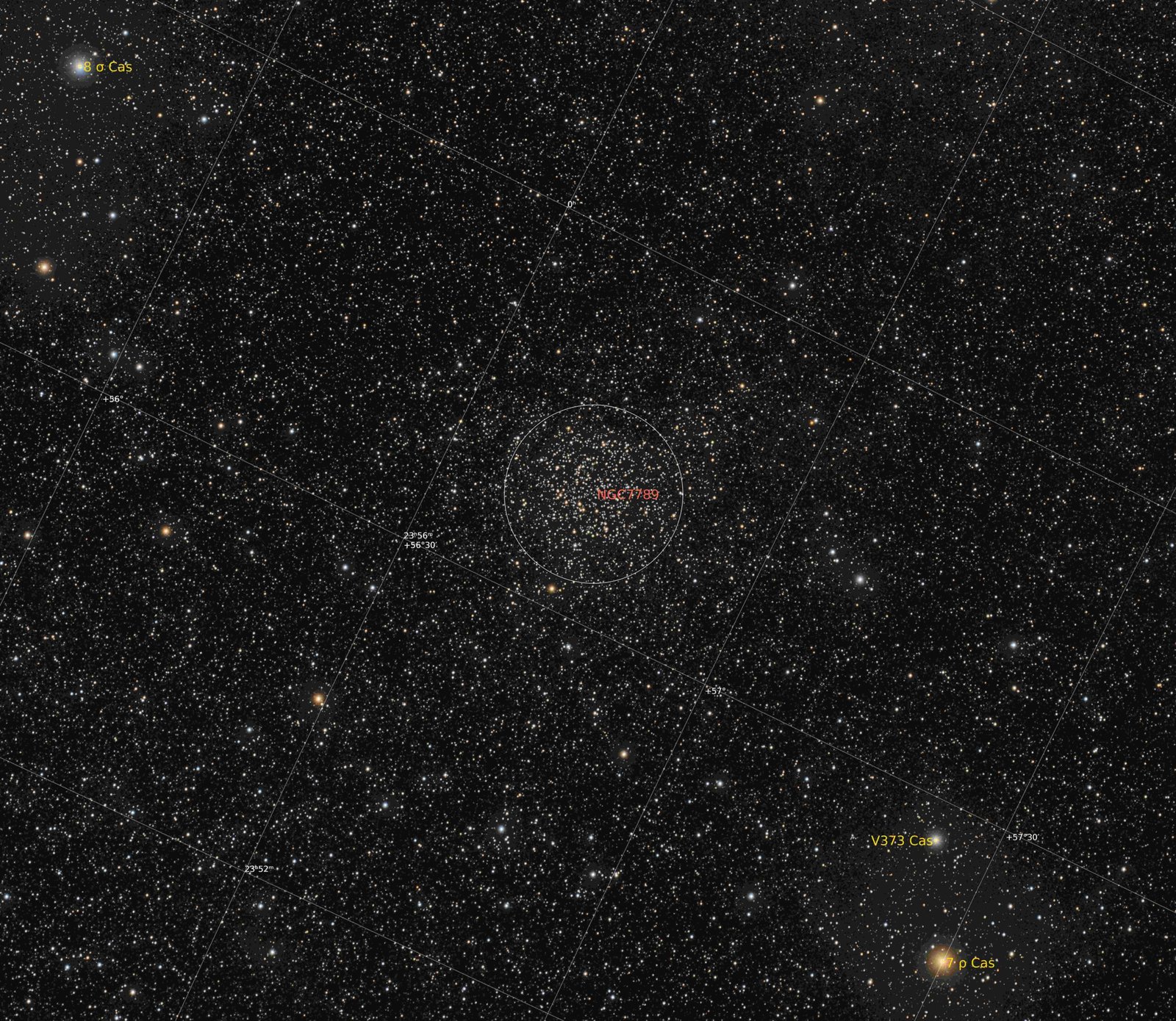 NGC 7789 – Carolines Rose Cluster ist ein offener Sternhaufen. Mit rund 1,6 Milliarden Jahren ist dieser bereits ungewöhnlich alt. Das hohe Alter des Haufens lässt sich aus dem Entwicklungsstadium der Sterne schließen. Viele der Mitgliedsterne haben die Hauptreihe bereits verlassen und sich zu roten Riesen weiterentwickelt, woraus visuell auch der warme, orange-rötliche Eindruck entsteht. Astronomen schätzen die Gesamtzahl der Sterne auf etwa 1000 Exemplare. Die orange-roten Riesensterne vom Typ K4 (späte Spektralklasse/älterer Stern) III (normale Riesen) sind mit einer absoluten Helligkeit von -2m3 die leuchtkräftigsten Sterne. Die scheinbare Helligkeit des hellsten Mitgliedsterns erreicht 10m,7, währenddessen die Gesamtleuchtkraft des Haufens, die unserer Sonne um das 3000-fache übersteigt. Die Entfernung von NGC 7789 wird unterschiedlich angegeben und variiert zwischen 6000 und 8000 Lichtjahren. Nimmt man den kleineren Wert an, erreicht der Sternhaufen eine wahre Ausdehnung von rund 50 Lichtjahren. Der Sternhaufen wird laut der Trumpler-Klassifikation dem Typ II 2 r zugeordnet, was ausgesprochen so viel bedeutet wie: „frei stehend, mit geringer Konzentration mehr als 100 Sterne“. NGC 7789 erscheint eher, aufgrund seines hohen Alters und seines konzentrierten Erscheinungsbildes, als ein Zwischending von offenem Sternhaufen und Kugelsternhaufen. Durch diesen Zustand kam es in der Fachwelt immer wieder zu Diskussionen über die Natur von NGC 7789. So führten 1958 unter anderem der amerikanische Astronom Allan Rex Sandage und die britische Astronomin Eleanor Margaret Peachey den Beweis an, dass es sich bei NGC 7789 tatsächlich um einen offenen Sternhaufen handelt.