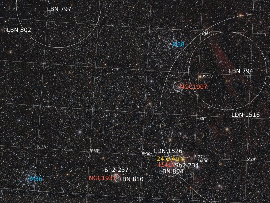 Im Feldstecher 10×50 zeigt er ein Wölkchen mit 10 bis 15 Sternen 9. bis 10. Größe, in einem 20cm-Spiegelfernrohr bereits über 60, doch weniger als seine Nachbarn M37 und M38. Insgesamt dürfte er fast 200 Sterne umfassen.