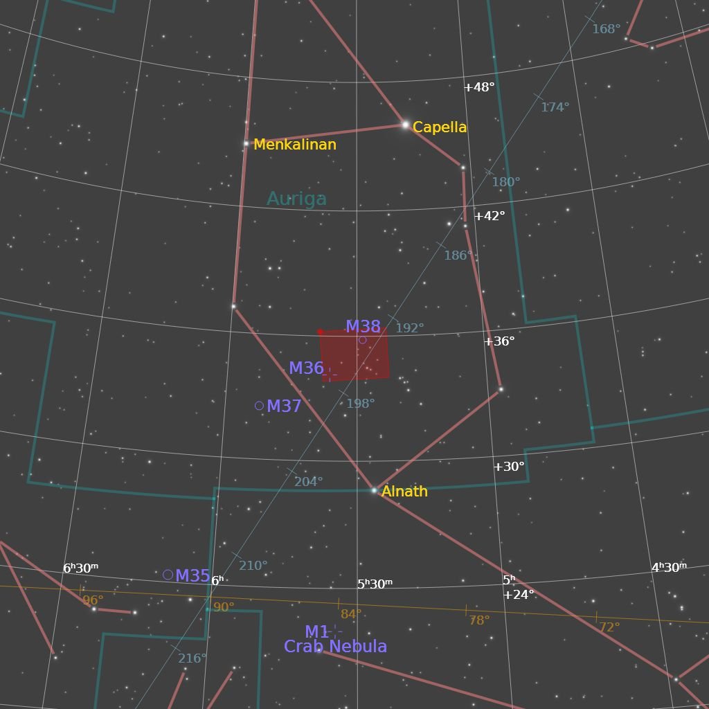 Messier 36 (auch als NGC 1960 bezeichnet) ist einer der drei offenen Sternhaufen im Wintersternbild Fuhrmann. Seine Helligkeit beträgt +6,0 mag, seine Winkelausdehnung 10′.