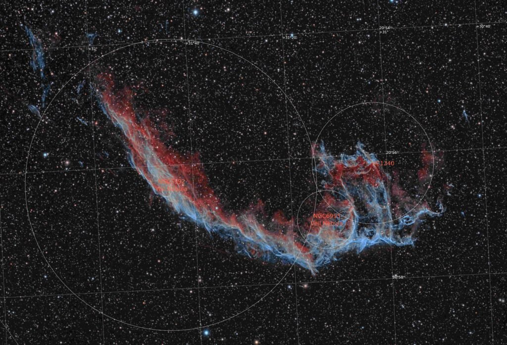 Diverse Teile des Überrests haben verschiedene NGC- und IC-Nummern. So gehören die Objekte NGC 6960, NGC 6974, NGC 6979, NGC 6992, NGC 6995 und IC 1340 alle zur selben Struktur.